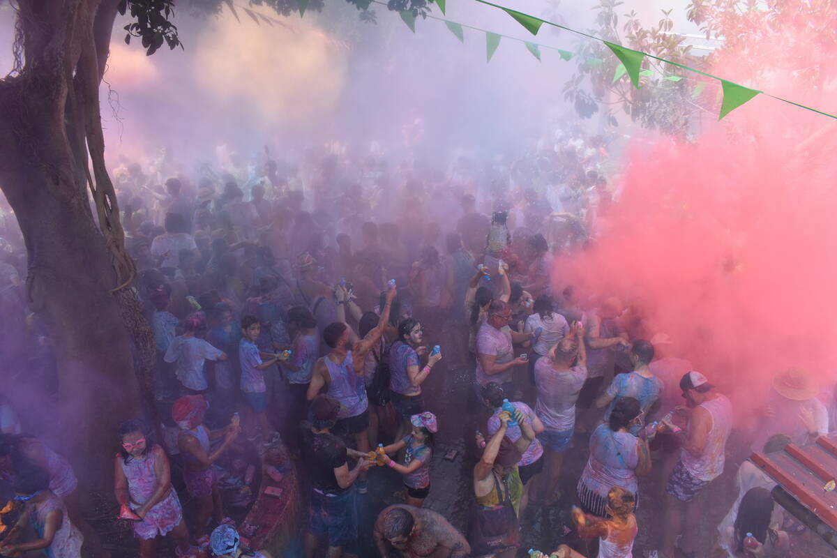 Después, el poblado de Namastepur se ha convertido en el epicentro de la celebración con la esperada batalla de colores. Más de 320 kilos de polvos pigmentados y botellas de agua tintada en ocho tonalidades han teñido el ambiente, acompañados por música y coreografías de Bollywood que han animado a visitantes de todas las edades.