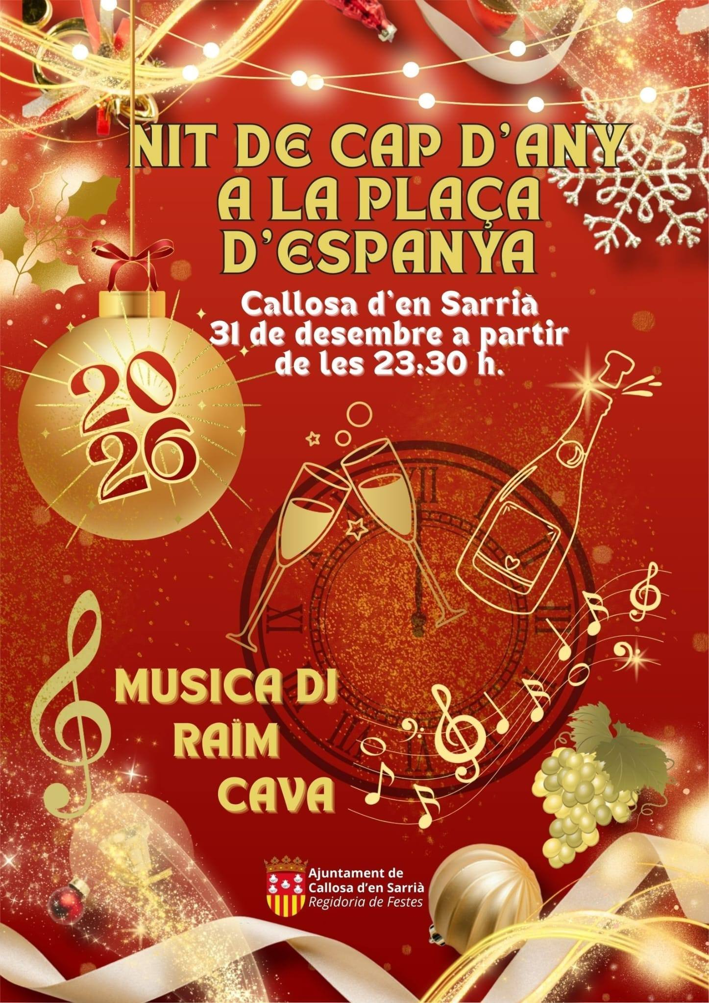 La noche del 31 de diciembre al 1 de enero (Nochevieja), a las 23:30 os esperamos a todos en la Plaza de España de Callosa, para despedir el 2025 y darle la bienvenida al 2026 con uvas, cava y DJ.