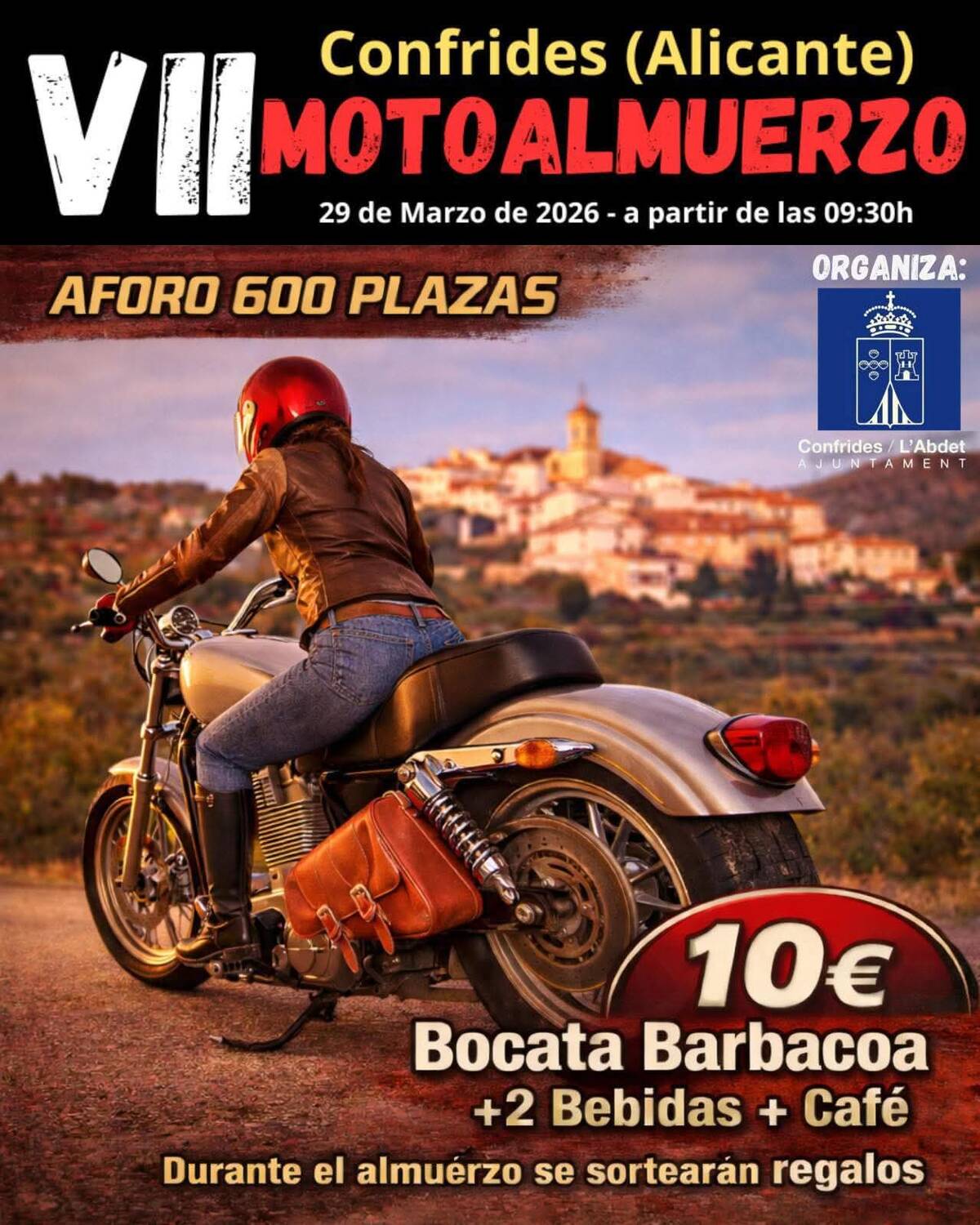 Confrides ya lo tiene todo listo para celebrar el próximo domingo 29 de marzo de 2026 el esperado VII Motoalmuerzo, una cita consolidada como una de las grandes fiestas moteras de la comarca y que cada edición reúne a cientos de aficionados a las dos ruedas.