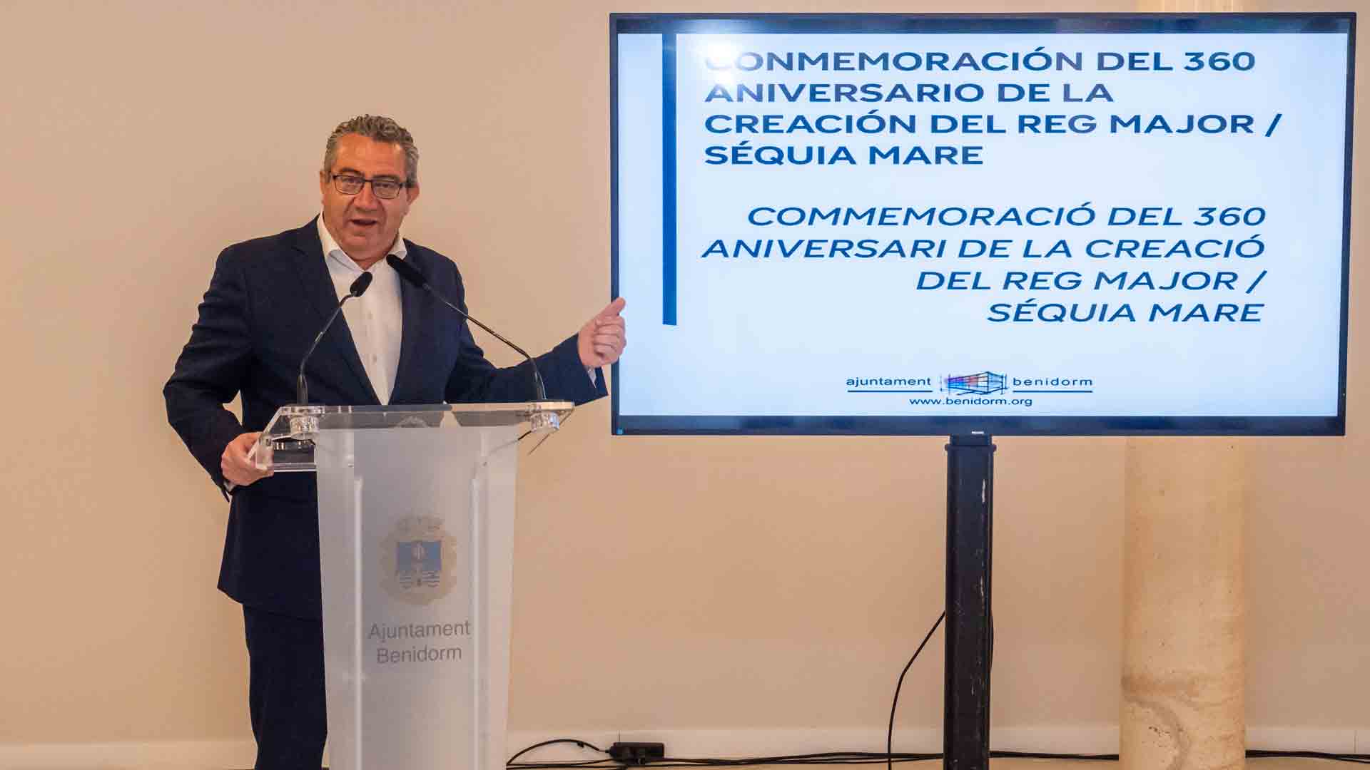Tras el concejal, el catedrático e historiador, Francisco Amillo, se ha dirigido a los asistentes rememorando los 360 años de la creación del Riego Mayor que permitió la llegada del agua a Benidorm “de la que dependía la supervivencia de un pueblo que no tenía río como Altea o la Vila Joiosa”.