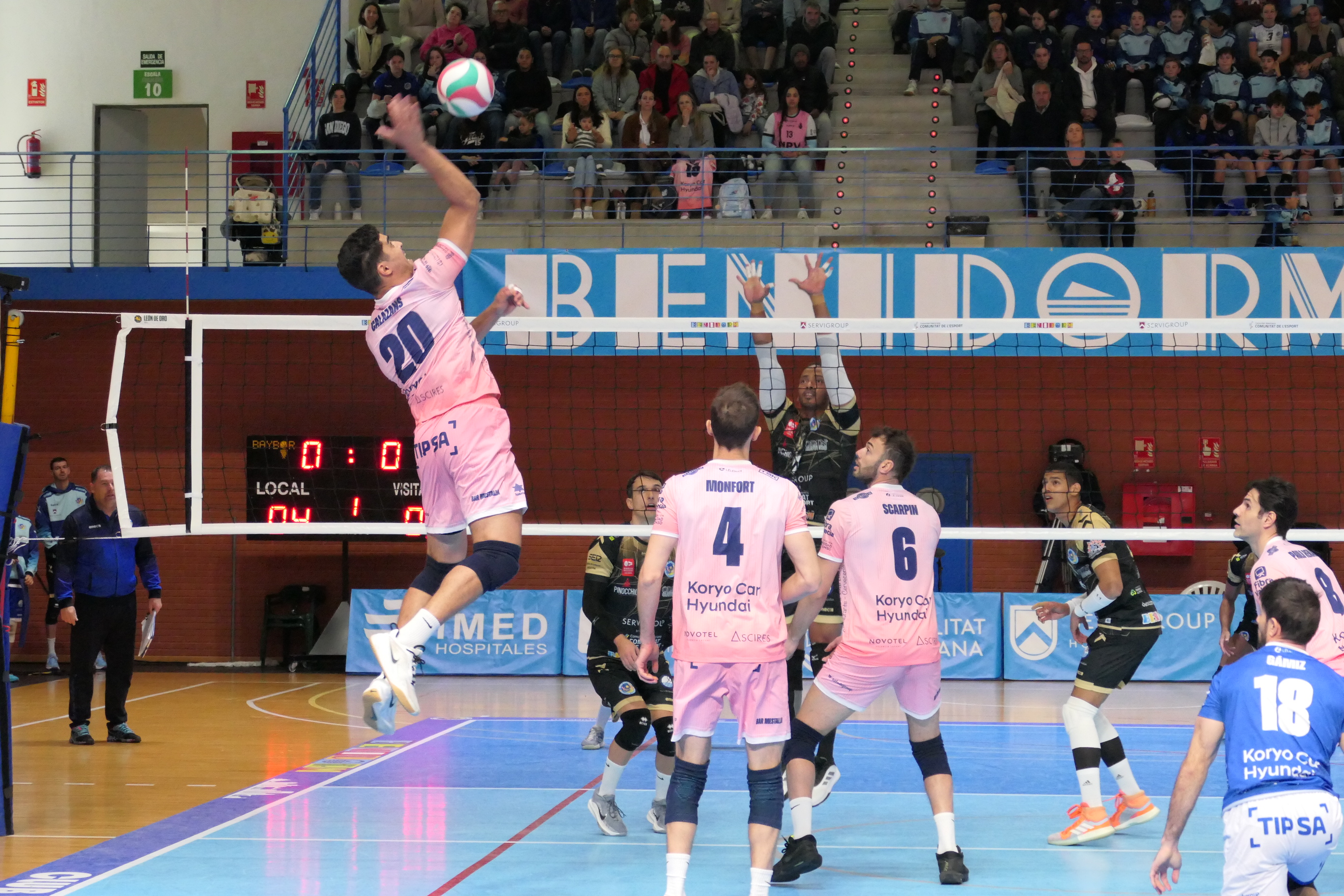El Servigroup Benidorm cayó este sábado en su primer derbi valenciano de la historia de la Superliga Masculina ante el Conqueridor Valencia por 0-3 (23-25, 23-25, 22-25) en un Palau d’Esports l’Illa de Benidorm repleto, con un ambiente excepcional y una afición que volvió a empujar al equipo en todo momento.