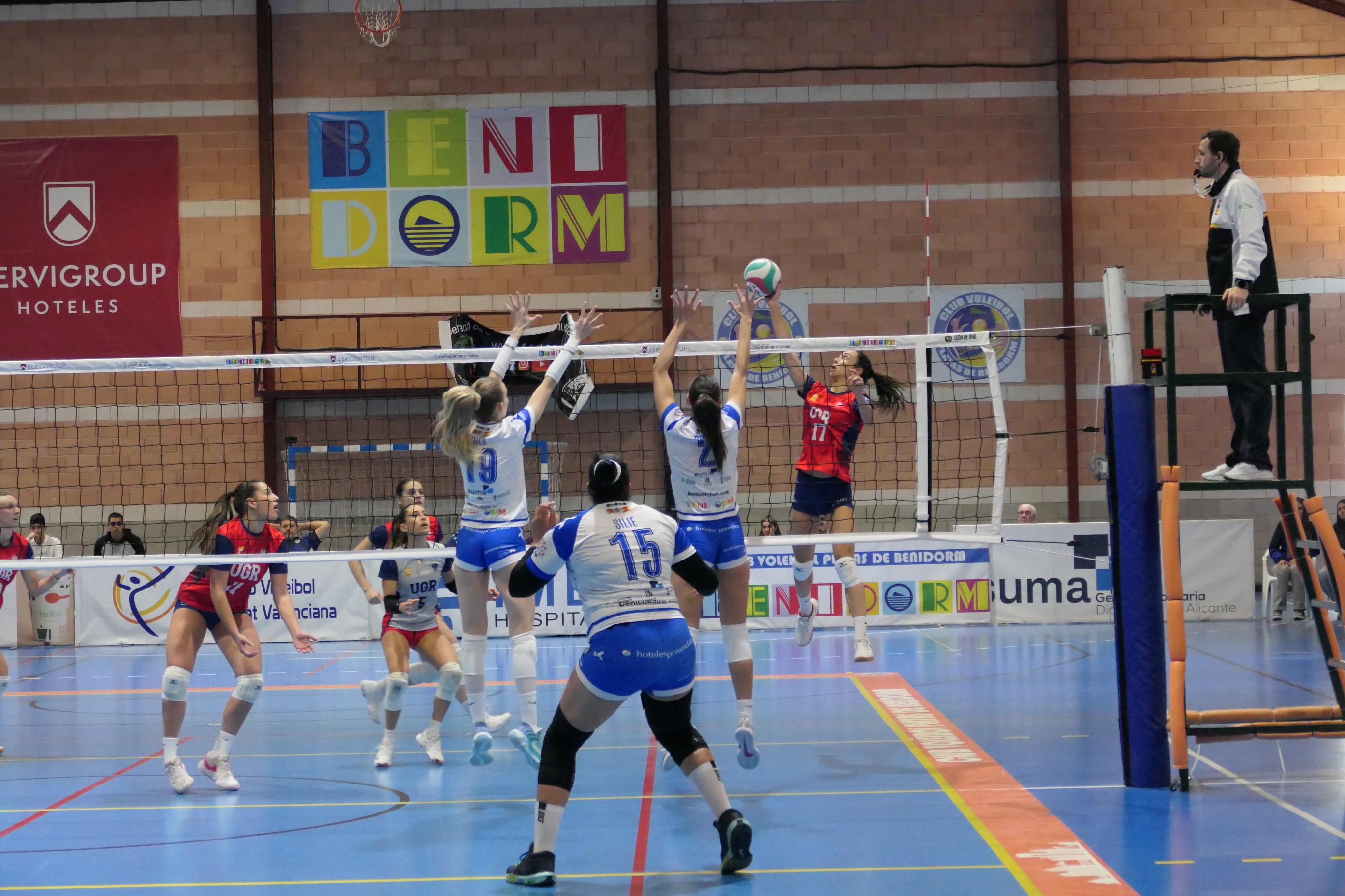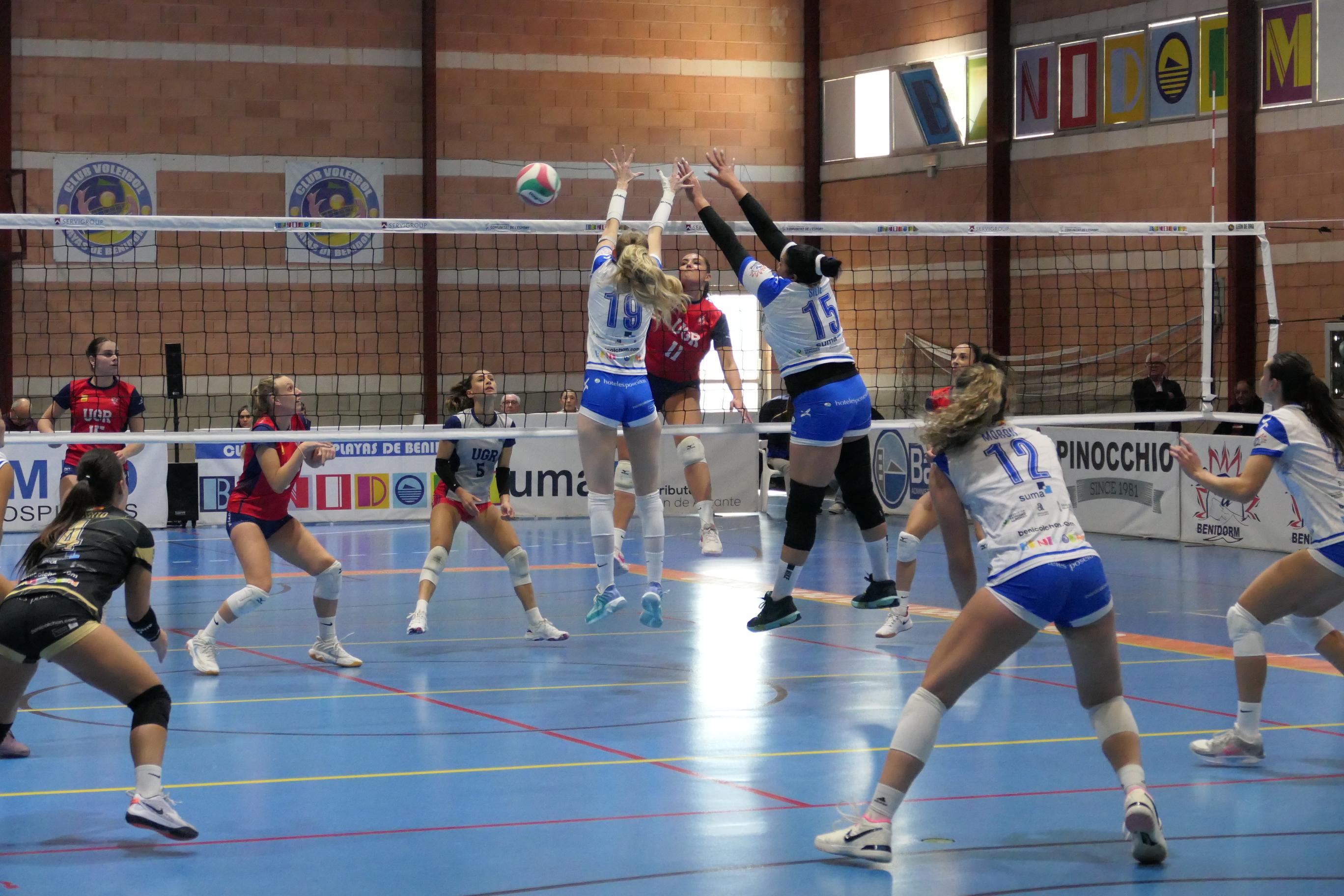 El Servigroup Playas de Benidorm consiguió una importantísima victoria frente a la Universidad de Granada por 3-1 (25-23, 25-23, 17-25, 25-19) en un partido vibrante, igualado y con alternativas, disputado este domingo en el Pabellón Raúl Mesa. El conjunto de Noelia Santacreu se mostró sólido en los momentos clave, aprovechó su madurez y sumó tres puntos que le permiten adelantar al conjunto granadino y situarse de nuevo en la pelea directa por la tercera posición del Grupo C.