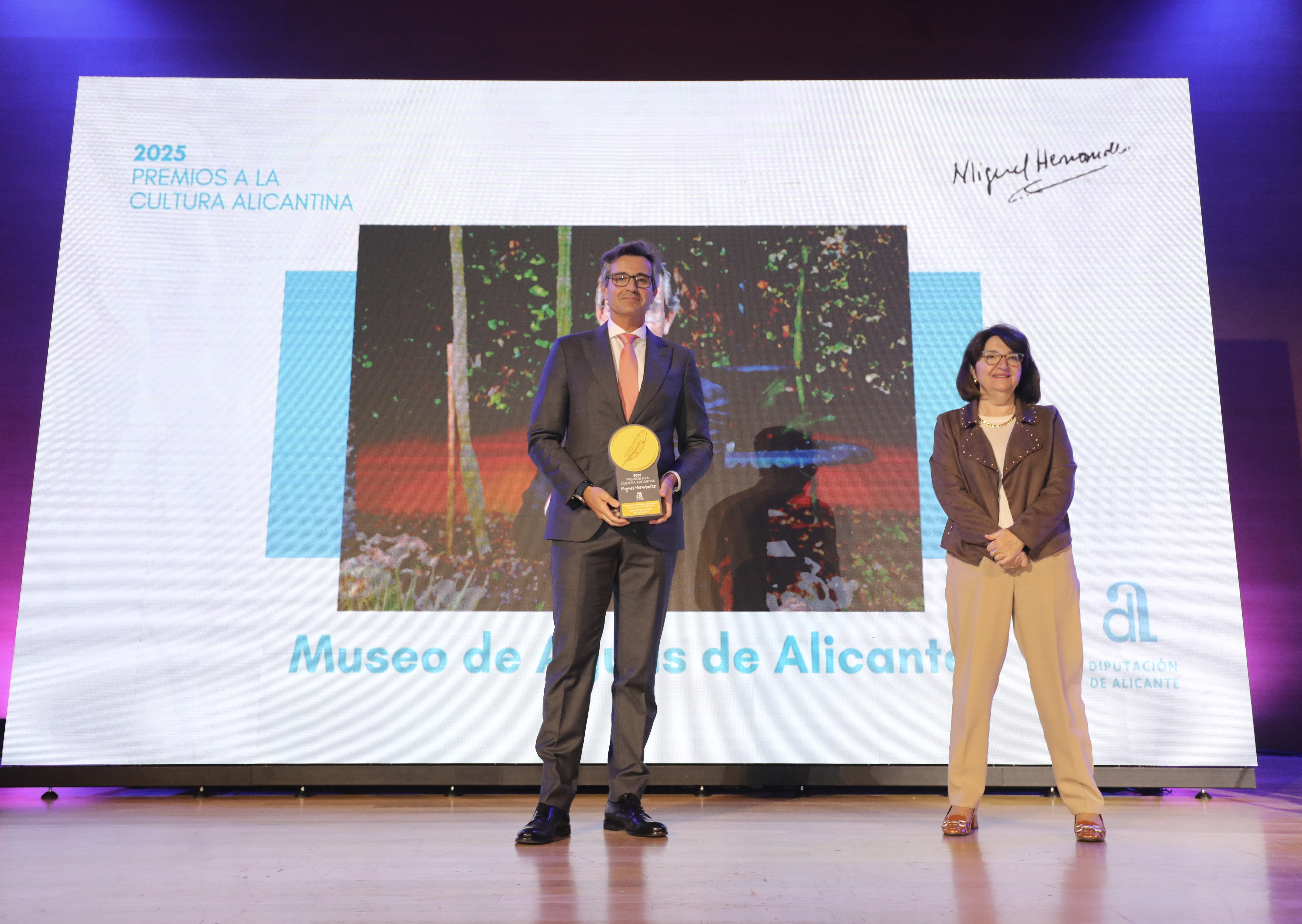 La Diputación de Alicante ha celebrado esta tarde en el ADDA la gala de entrega de los Premios a la Cultura Alicantina Miguel Hernández 2025, que este año han reconocido la trayectoria del catedrático José Carlos Rovira, así como a la guitarrista Sandra Monfort, a los artistas del Colectivo Fluenz, a la Revista Crevillente Semana Santa y al Museo Aguas de Alicante. Además, el Embajador Cultural de la Provincia de esta quinta edición es la empresa Alhambra Guitarras, que este año conmemora el sesenta aniversario.