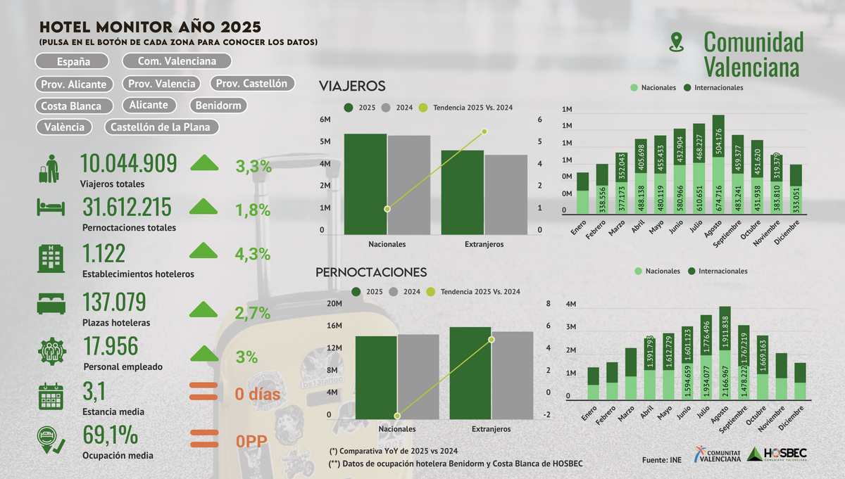 Hoteles y apartamentos turísticos impulsan la producción y el empleo turístico en la Comunitat Valenciana en 2025.