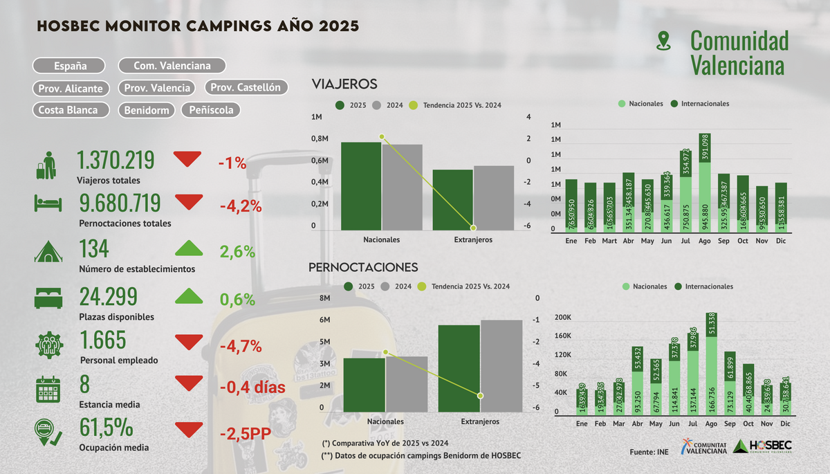 Aun así la actividad de los campings no se puede ignorar: casi 10 millones de pernoctaciones en el año 2025 y 1,4 millones de clientes alojados en esta modalidad.