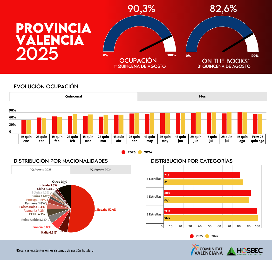 En cuanto a las reservas para el final agosto, los datos "on the books" apuntan a unos buenos resultados en ambos destinos. La provincia de Valencia enfrenta la segunda quincena con un 82,6% de ocupación ya confirmada, mientras que en València ciudad el dato se sitúa en un 79,1%. Aunque las cifras son algo más contenidas que en ejercicios anteriores, siguend siendo valores muy elevados que mejoran los datos de las últimas quincenas del año.