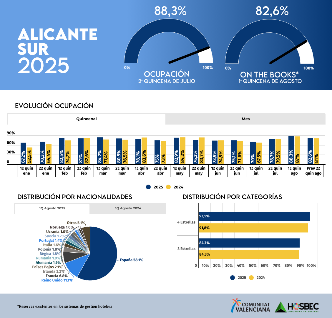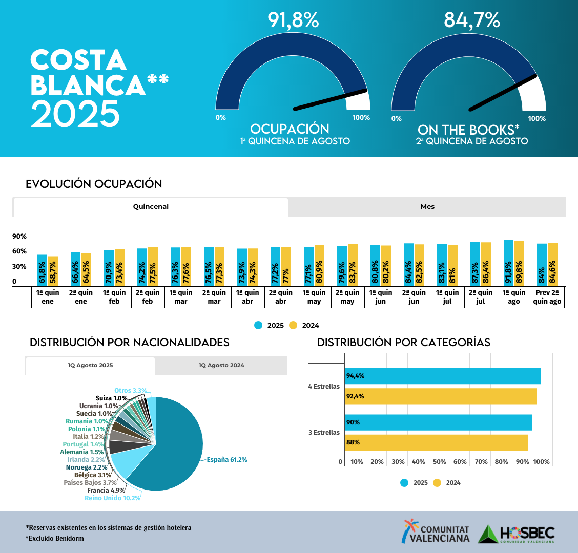 De cara al final de agosto, las reservas ya confirman una continuidad de la buena tendencia: la segunda quincena parte con un 89,7% on the books, lo que anticipa otro periodo de alta actividad para el principal destino turístico de la Comunitat Valenciana.