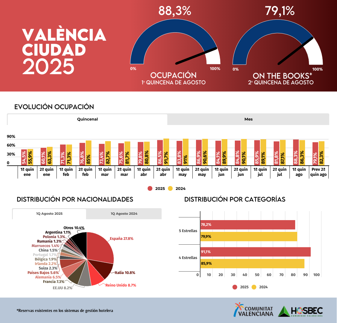 En el caso de València ciudad, el análisis confirma la misma tendencia, por primera vez en este verano se han mejorado los resultados del año pasado. Así, la primera quincena de agosto se cierra con una ocupación del 88,3%, dos puntos por encima del dato de 2024.