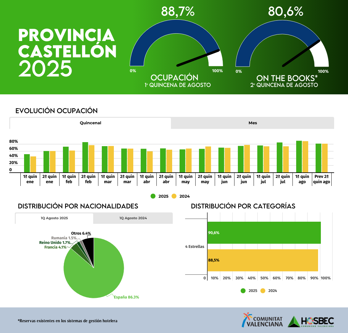 Castellón ha consolidado la buena evolución iniciada durante el mes de julio, y crece un punto en la ocupación hotelera hasta el 88,7%. Además, es el paraíso para los turistas españoles, con el mayor número de visitantes patrios de todos los destinos analizados.