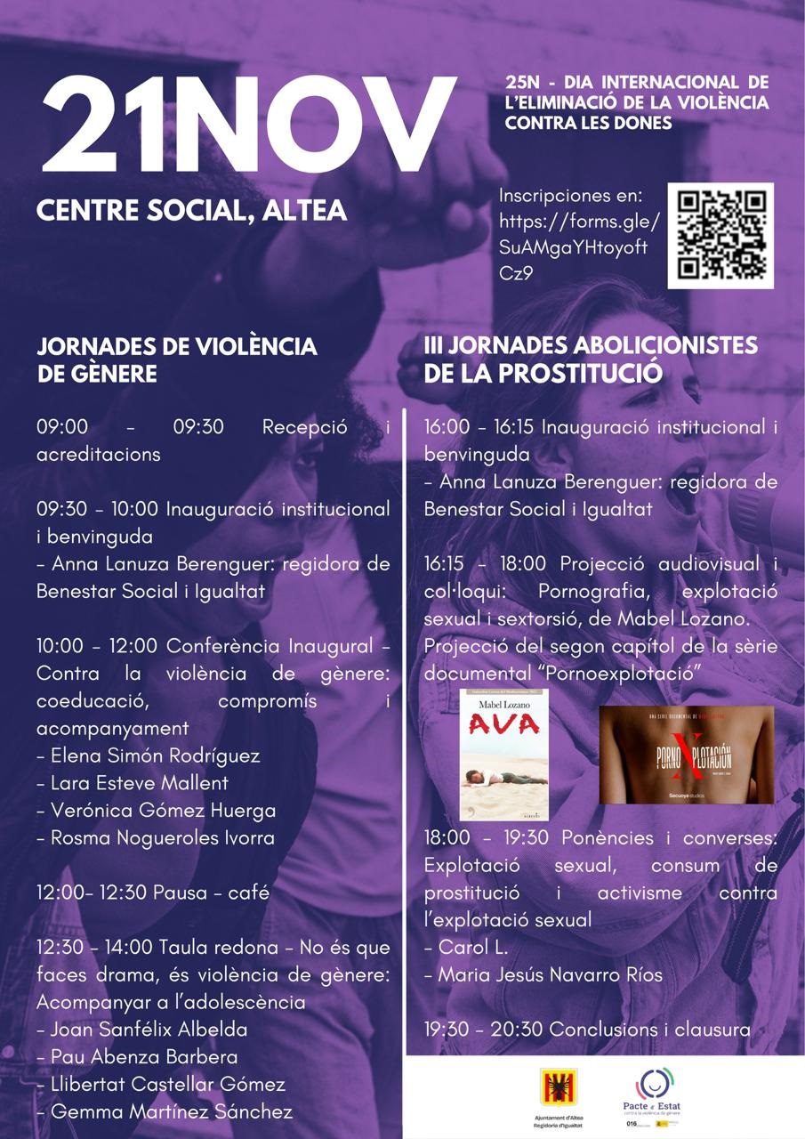 El plato fuerte de la programación tendrá lugar este viernes 21 de noviembre con las I Jornadas sobre Violencia de Género en horario de mañana y las III Jornadas Abolicionistas de la Prostitución, por la tarde. Ambas en el auditorio del Centro Social de Altea, gratuitas y abiertas a la ciudadanía, con diferentes mesas redondas y presencia de personas importantes en sa labor contra la violencia de género y contra la trata de personas.