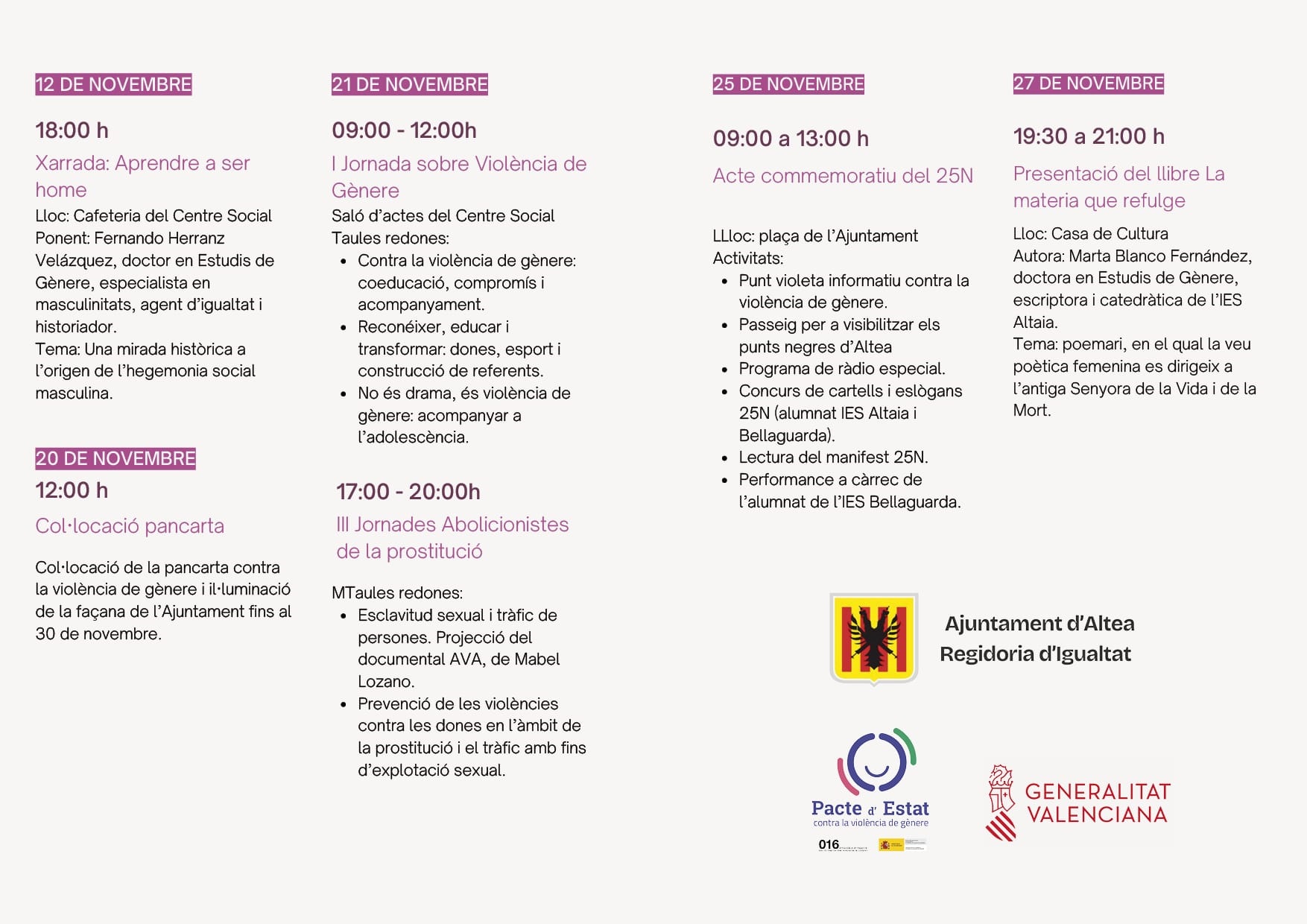 Todo esto será el viernes 21 de noviembre. El día 25, martes, como es habitual, la Plaza del Ayuntamiento será el escenario del acto conmemorativo con un programa en directo de Ràdio Altea durante toda la mañana. También habrá un Punto Violeta, gestionado con la colaboración de Cruz Roja; un paseo para visibilizarlos puntos negros del municipio; la entrega de premios del concurso de carteles y del concurso de lemas en los IES, en su primera edición, cuyo lema ganador ha sido ‘Ser con él y no ser de él’. La lectura del manifiesto correrá a cargo del alumnado del IES Altaia y una performance que cada año organiza el alumnado del IES Bellaguarda.