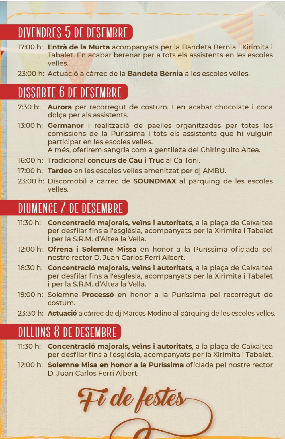 L´últim dia, el dilluns 8 de desembre, a les 11:30 concentració de majorals, veïns i autoritats a la plaça de Caixaltea per desfilar fins a l’església, acompanyats per la Xirimita i Tabalet. A continuación solemne missa en honor a la Puríssima, oficiada pel nostre rector, D. Juan Carlos Ferri Albert.
