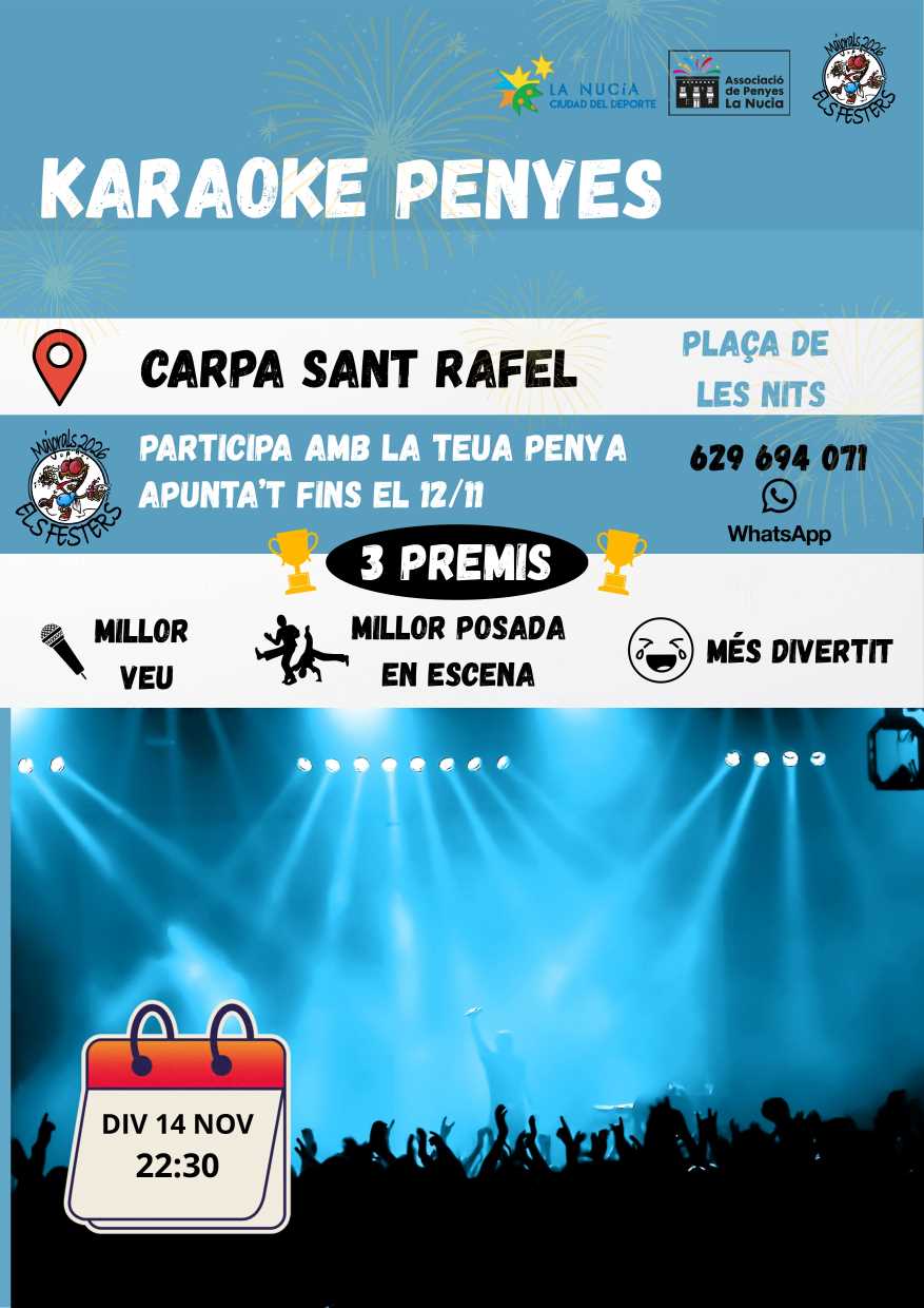 La fiesta empezará el viernes 14 de noviembre a las 22,30 horas con el III “Concurso de Karaoke Fester de Penyes” con premios económicos a las mejores “voces festeras”. Habrá premios a la: Mejor Voz, Mejor puesta en escena y Más Divertido. Todos los premios están patrocinados por l’Associació de Penyes. Las penyas interesadas deben inscribirse vía en el teléfono 629694071.