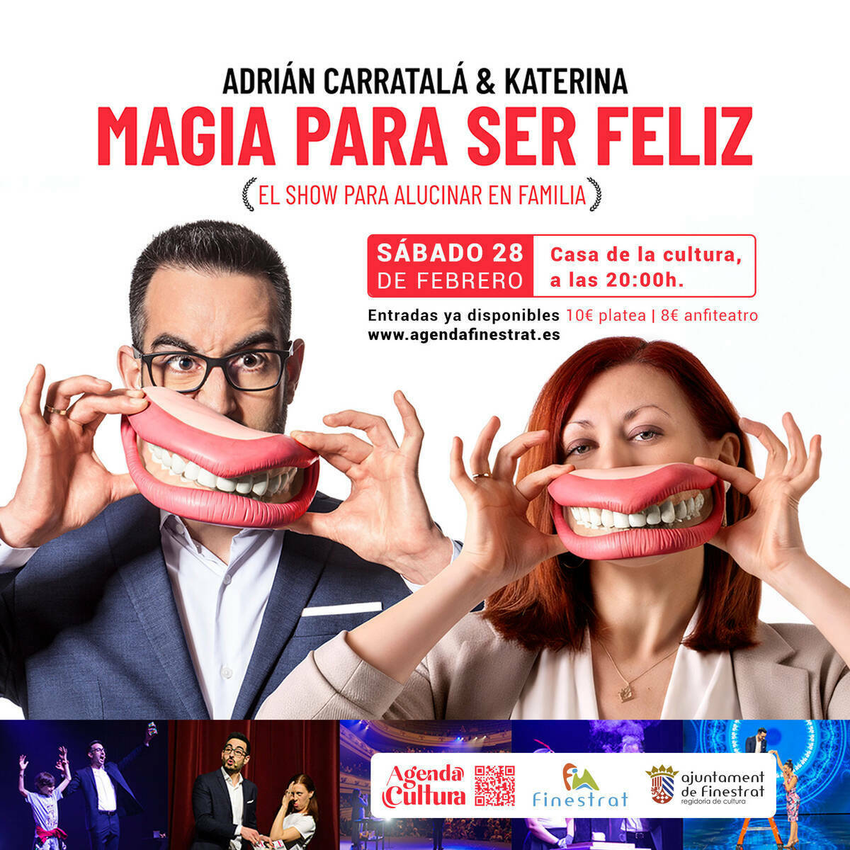 Llega a la Casa de Cultura de Finestrat el espectáculo “Magia para ser feliz” con Adrián Carratalá y Katerina Muzychuk. Son dos de los magos más creativos de España, tricampeones de España de magia, 3º Premio Europeo de Magia de Salón, Semifinalistas de Got Talent España y vencedores en 2019 del prestigioso programa de TV estadounidense Penn and Teller Fool us en Las Vegas. En sus más de 25 años de carrera han llevado su magia a escenarios de toda España, Europa y Estados Unidos. Adrián y Katerina crean su propia magia original y la presentan de una forma divertida y muy cercana al público.