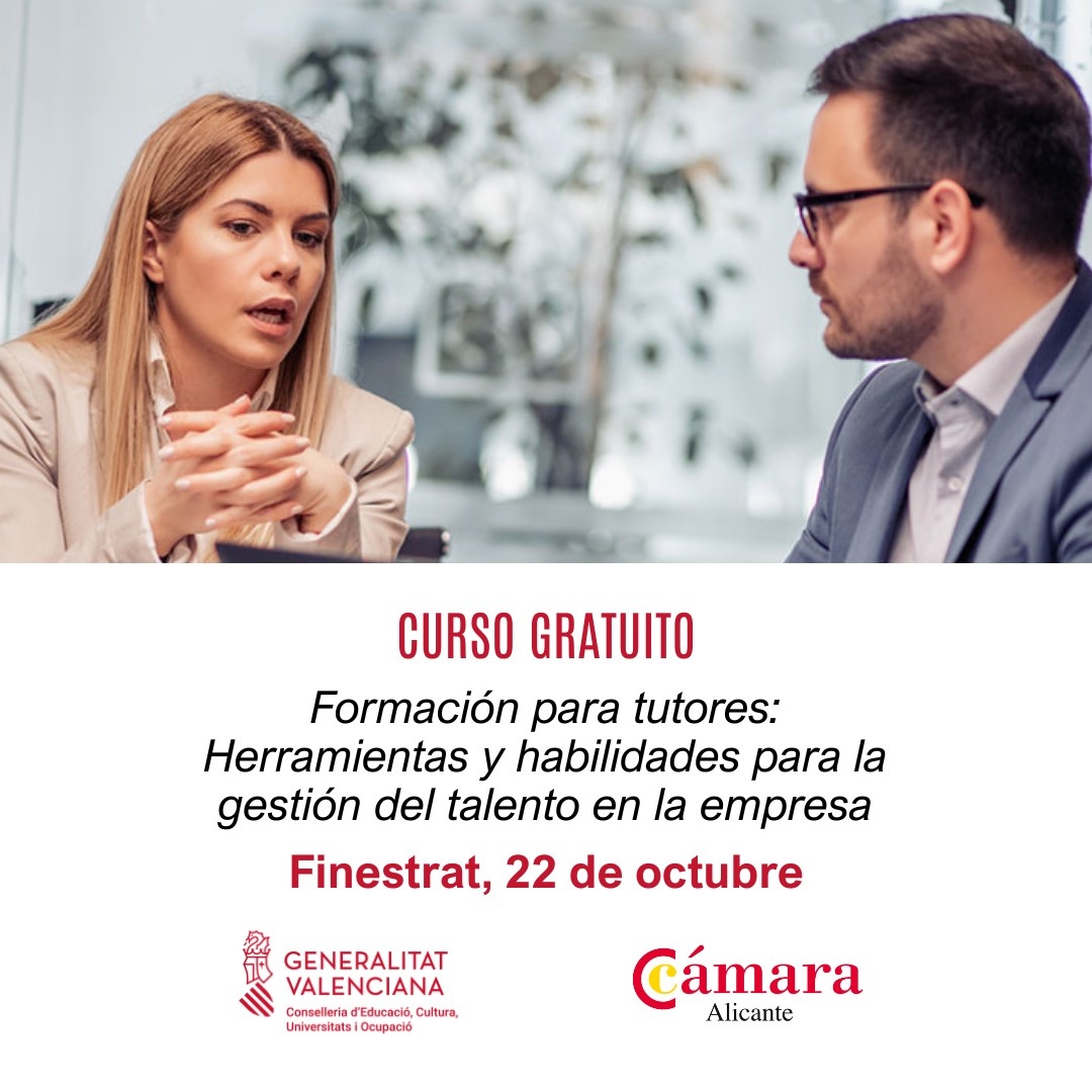 la Conselleria de Educación, Cultura, Universidades y Empleo, a través de Cámara Alicante, pone en marcha el curso titulado “Formación para tutores: Herramientas y habilidades para la gestión del talento en la empresa”. Esta formación está pensada para profesionales que tienen o pueden tener personas en prácticas a su cargo. Será del 22 de octubre al 4 de noviembre en horario de 16:00 a 20:00 horas. Un tutor bien preparado enseña, inspira, orienta y convierte la experiencia en prácticas en una verdadera oportunidad de crecimiento. Con esta formación gratuita, los asistentes aprenderán a acompañar el talento desde el primer día y convertirlo en valor real para sus empresas.