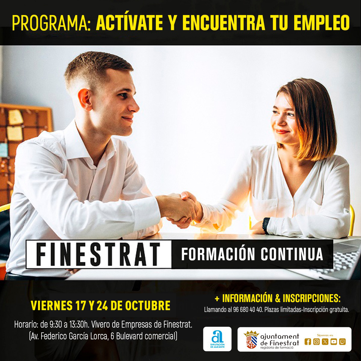 Por otra parte, desde la Concejalía de Empleo y Formación del Ayuntamiento de Finestrat y en colaboración con la Diputación de Alicante han organizado una nueva edición del programa “Actívate y encuentra tu empleo” dirigido a todas aquellas personas que están buscando trabajo o se están planteando cambiar de empleo.