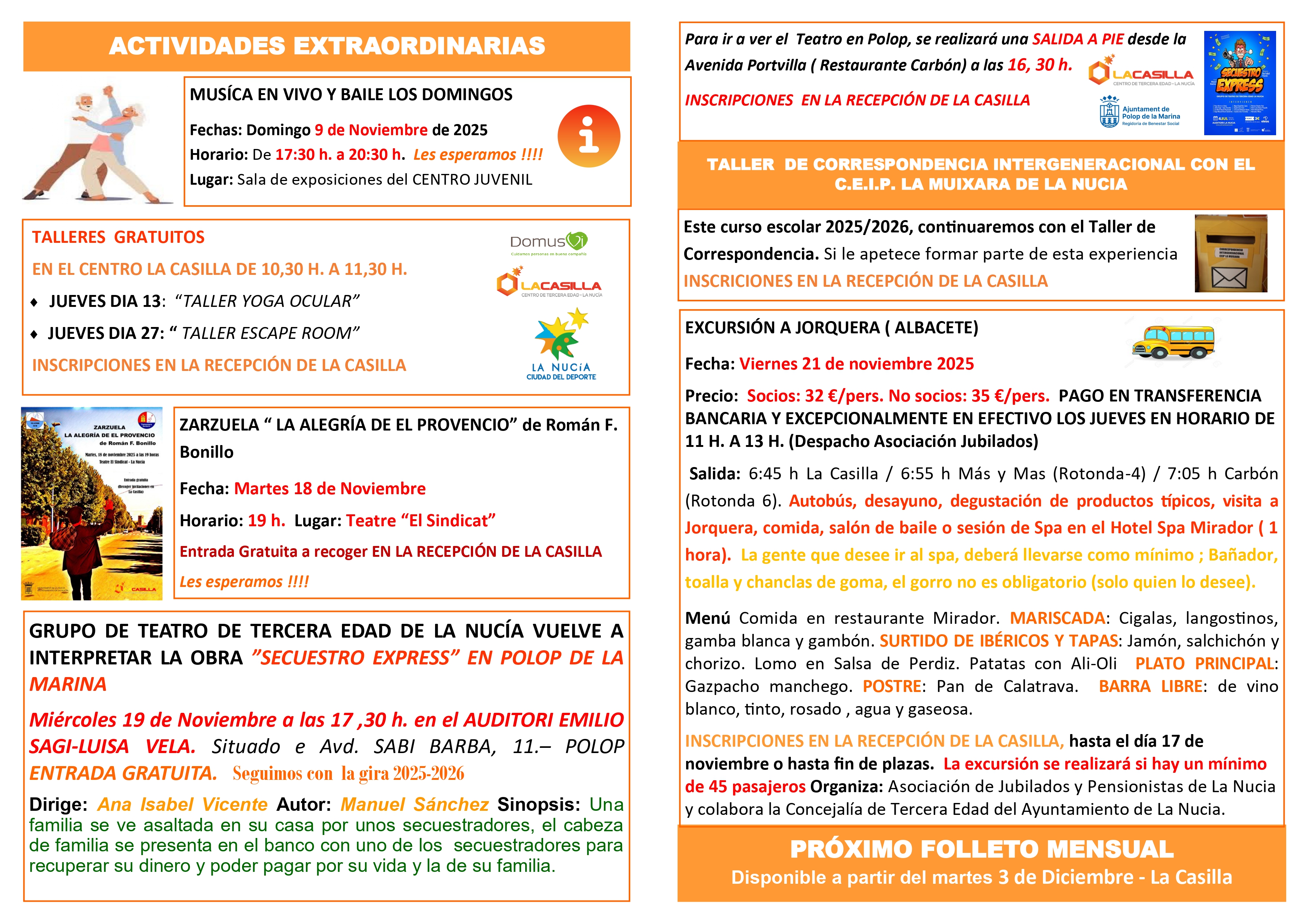 La concejalía de la Tercera Edad en colaboración con la Asociación de Jubilados y Pensionistas de La Nucía ha elaborado la programación de actividades para el mes de noviembre de 2025, entre las que destaca los talleres de yoga e intergeneracionales, el baile dominical, una acuación de zarzuela y una excursión a la localidad de Jorquera (Albacete).