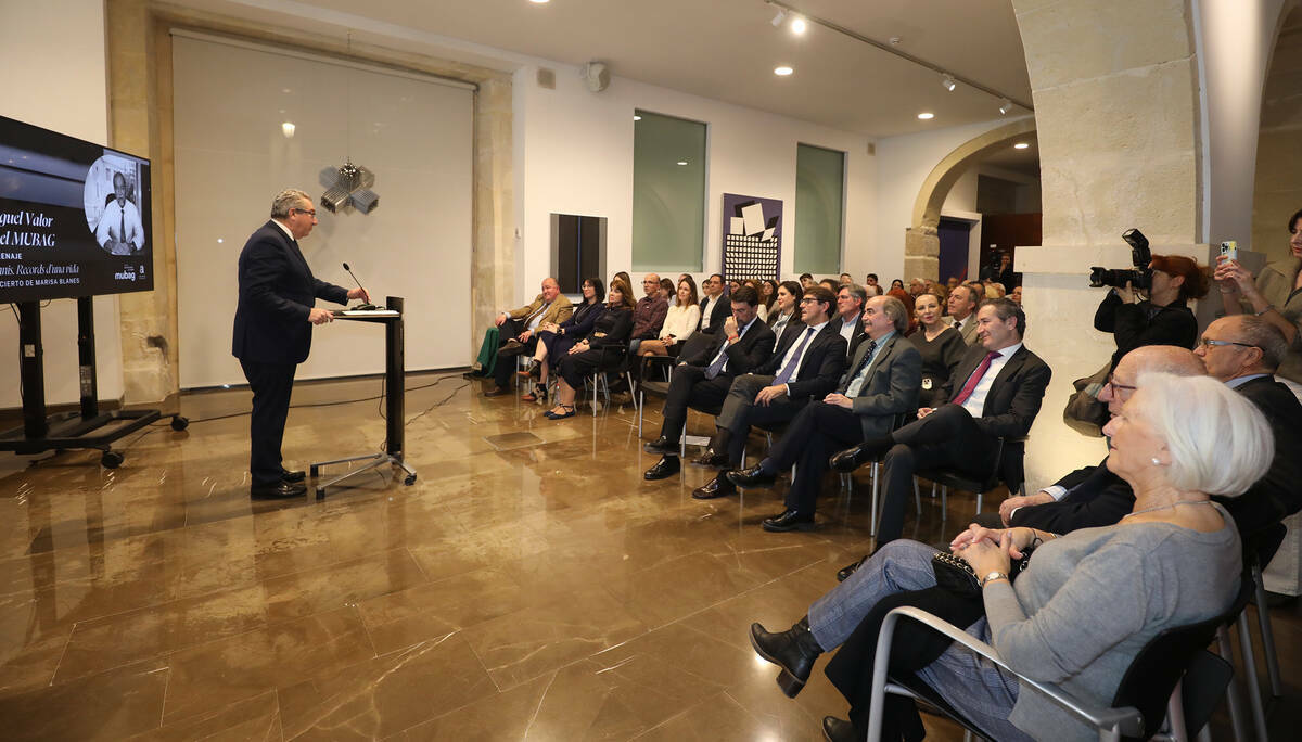 Más de un centenar de personas se han dado cita en el hall del Museo para rendir homenaje a Valor, entre ellas el director del Consorci de Museus de la Comunitat Valenciana, Nicolás Bugeda, el diputado provincial Carlos Pastor, la concejala de Cultura de Alicante, Nayma Beldjilali, la vicerrectora de la UMH, Mª Asunción Amorós, y los ex presidentes de la Diputación Antonio Mira Perceval y Julio de España, con quien Valor coincidió como diputado de Cultura.