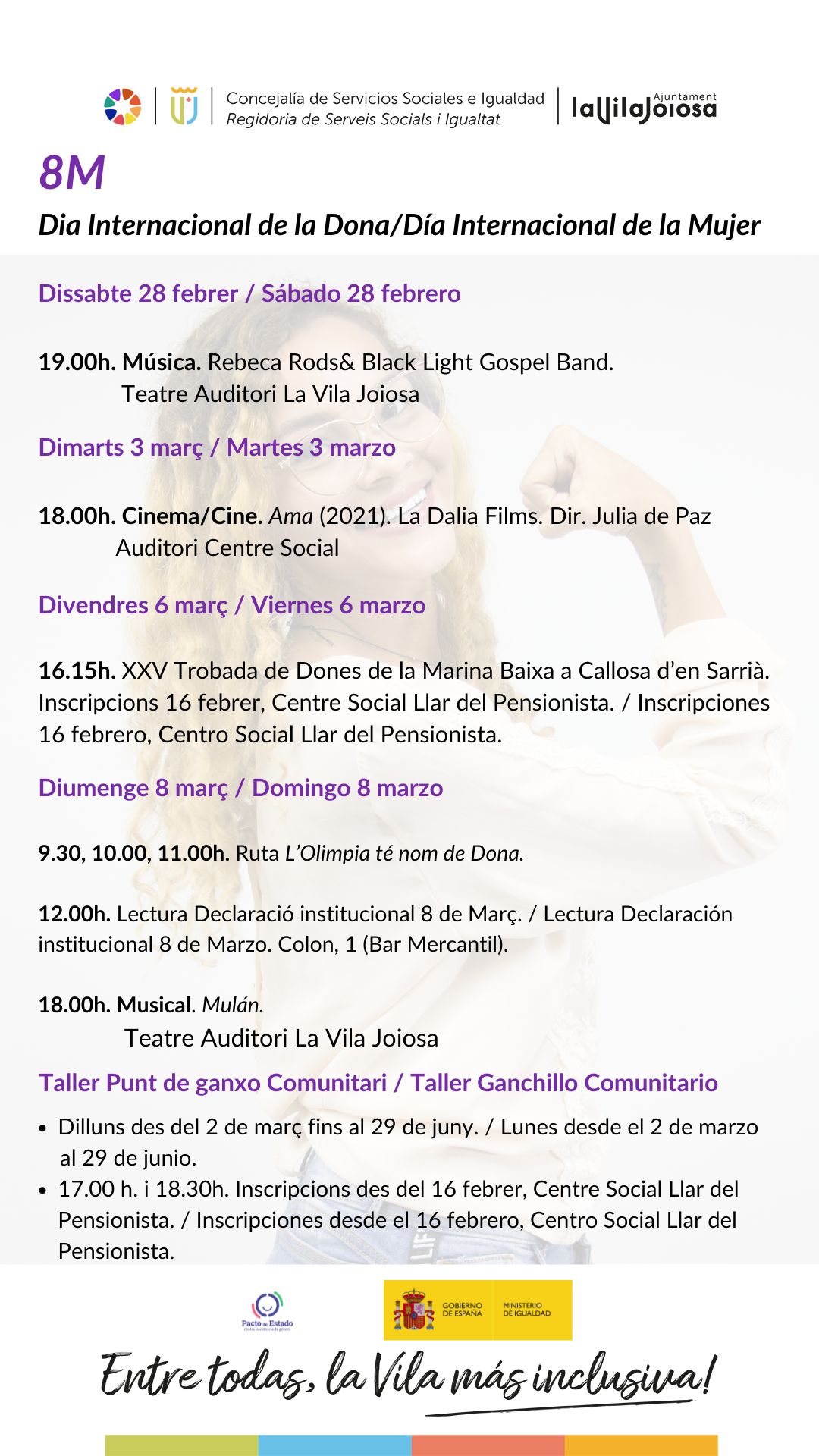 La concejalía de Igualdad y Servicios Sociales del Ayuntamiento de Villajoyosa conmemora el Día Internacional de la Mujer, el próximo 8 de marzo, con un amplio programa de actividades desde finales del mes de febrero hasta el mes de junio.