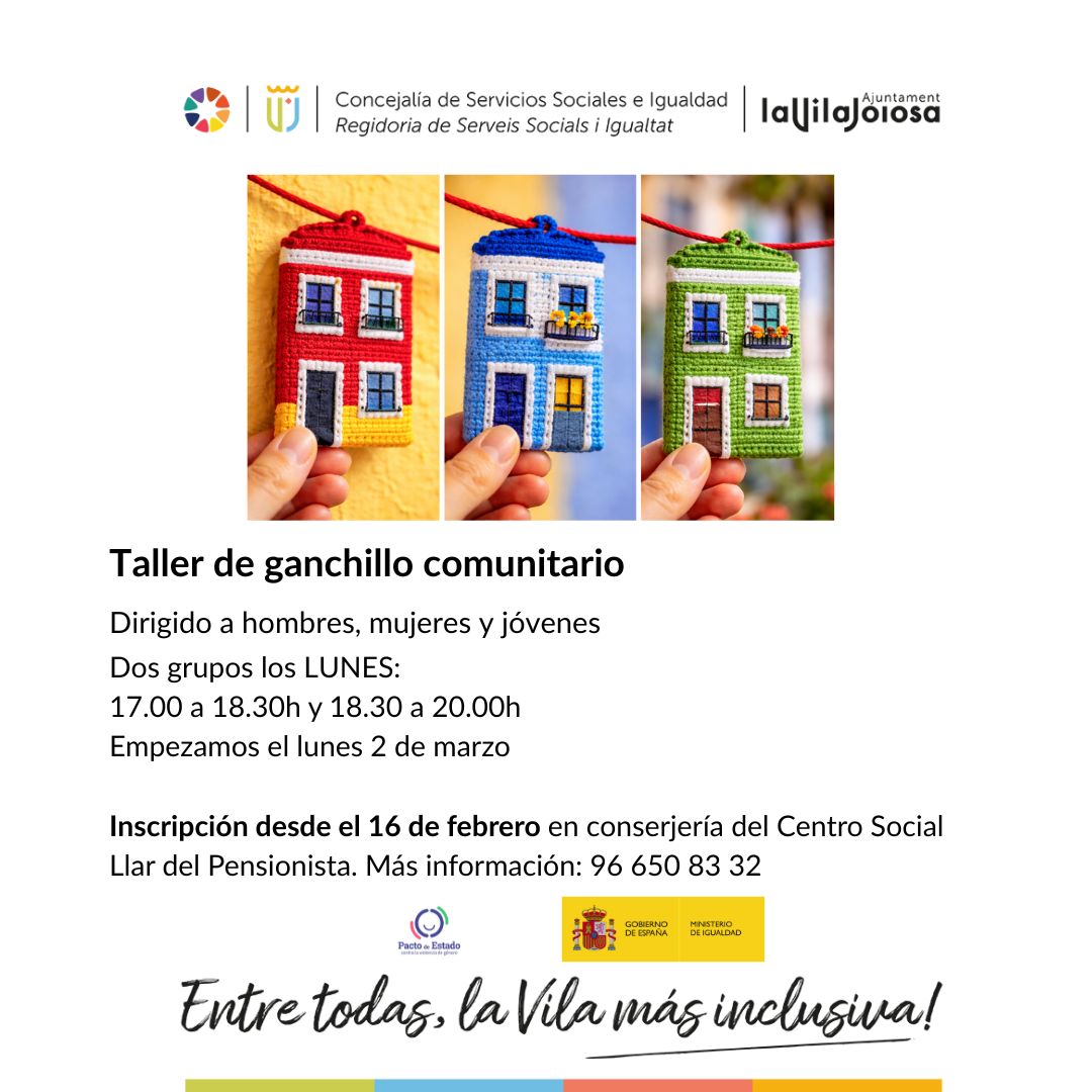 Además, la Concejalía de Servicios Sociales e Igualdad apuesta por la creación de espacios de encuentro continuo. Por ello, se pone en marcha el Taller de Ganchillo Comunitario, que se celebrará todos los lunes, desde el 2 de marzo hasta el 29 de junio, en el centro social Llar del
