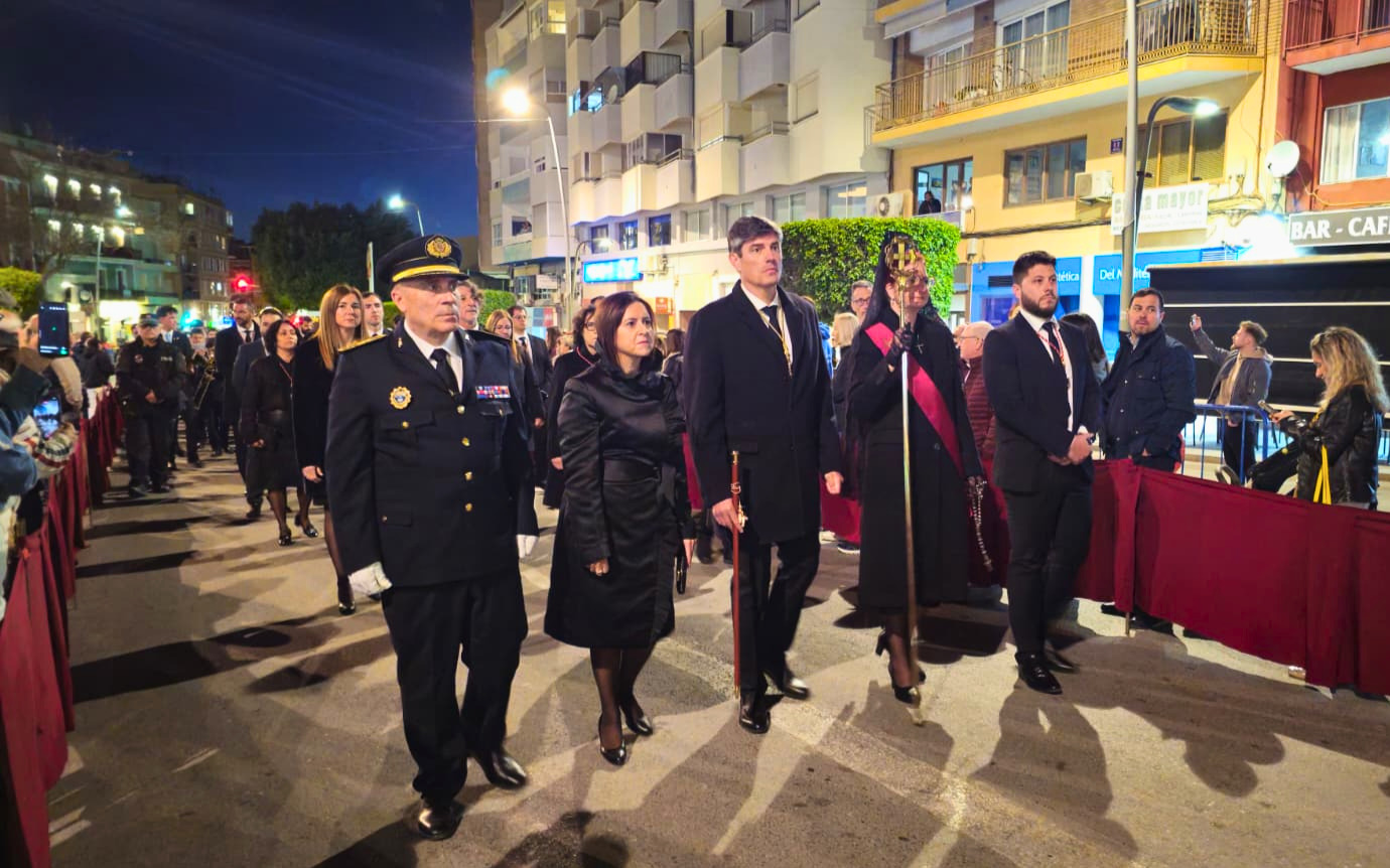La solemne procesión ha estado presidida por el Alcalde Marcos Zaragoza, quien ha cerrado la comitiva acompañado de la directora general de Innovación e Inclusión Educativa, Xaro Escrig; la presidenta de la Junta Mayor de Cofradías y Hermandades de la Semana Santa, Nancy Graciela Beltrán; y miembros de la Corporación municipal.